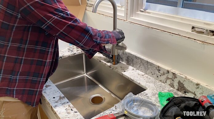 Instructional video on how to install a one handle kitchen faucet on a new under-mount sink. Here I install a Moen Georgene over granite. Check it out!