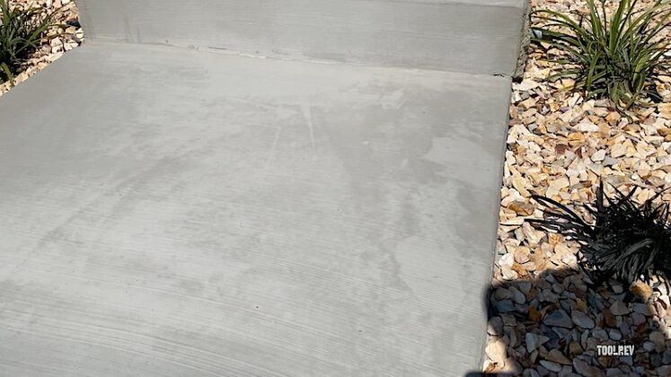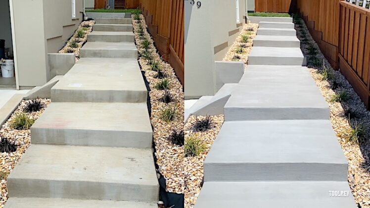 For step risers and walls, I brushed on the resurfacer, keeping a water bucket at hand to clean brushes. For texture, I added a broom finish, cleaning the broom in a water bin as I went.